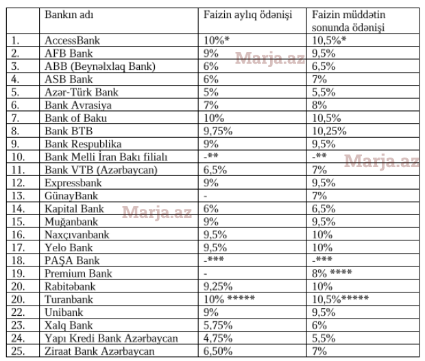 “Marja.az” araşdırmasına əsasən, hazırda 12 ay müddəti üzrə ən yüksək əmanət faizlərini AccessBank, Turanbank, Bank of Baku, Bank BTB, Naxçıvanbank, Yelo Bank və Rabitəbank təklif edir.