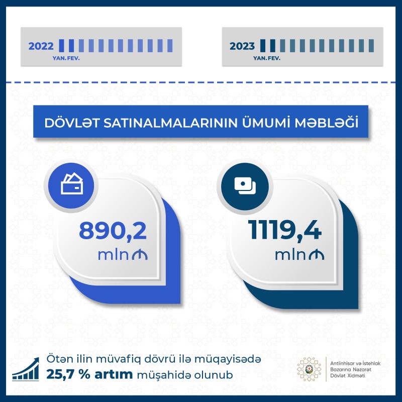 Bu ilin yanvar-fevral aylarında dövlət satınalmalarının ümumi məbləği 1 milyard 119,4 milyon manat olub ki, bu, ötən ilin müvafiq dövrü ilə müqayisədə 25,7% artım deməkdir.