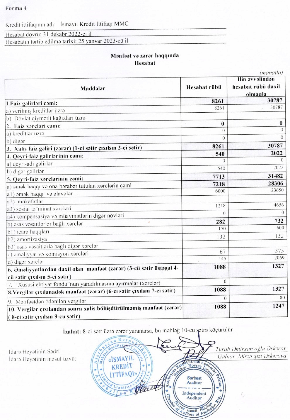"İsmayıl Kredit İttifaqı" MMC-nin 31 dekabr 2022-c il tarixində bitən il üzrə maliyyə hesabatları.