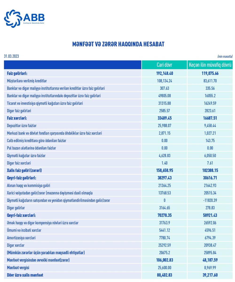 2023-cü ilin 1-ci rübündə ABB-nin cəmi əməliyyat gəlirləri isə (faiz və qeyri-faiz gəlirləri) 230,4 milyon manat təşkil edib. Bu da ötən ilin müvafiq dövrü ilə müqayisədə 54% və ya 80,7 milyon manat çoxdur.