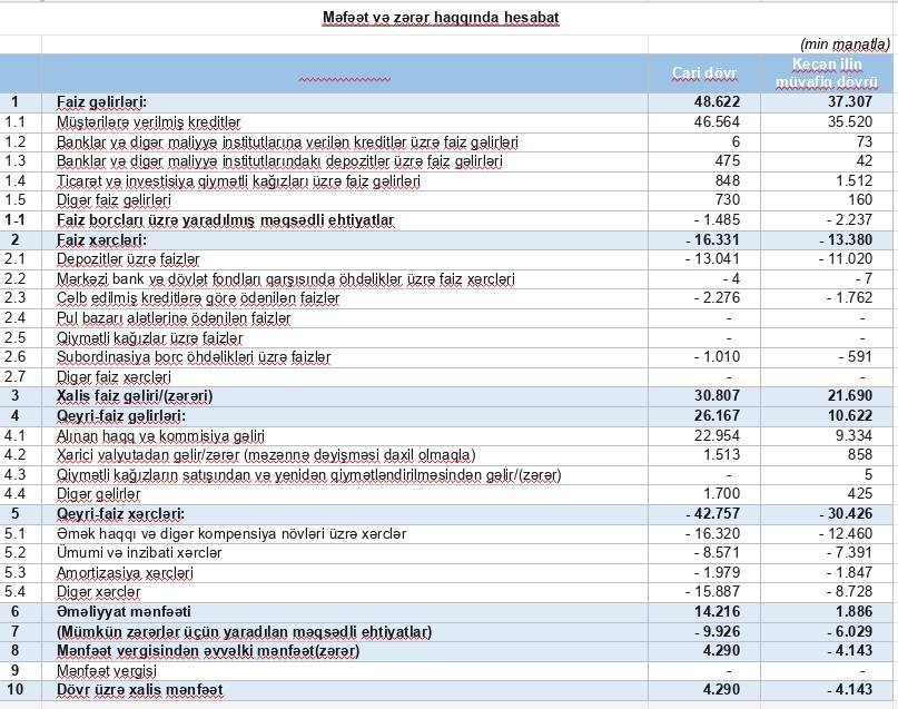 Qeyd edilib ki, hesabat dövrü ərzində Bankın məcmu gəlirlərində ciddi artım qeydə alınıb. Dövr ərzində cəmi gəlirlər ötən ilin müvafiq dövrü ilə müqayisədə 56% artaraq 75 milyon manata yaxınlaşıb. Bunun 48 milyon manatı faiz gəlirləri, 27 milyon manatı isə qeyri-faiz gəlirləri hesabınadır. Beləliklə bank birinci rübü 4,3 milyon manat xalis mənfəətlə başa vurub.