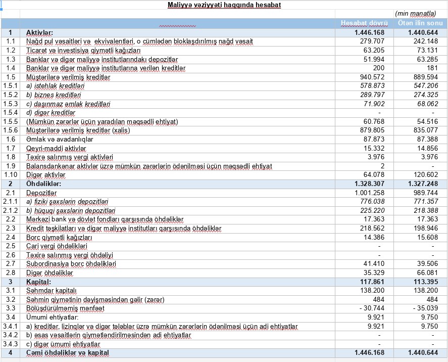 Bankın yaydığı press-relizdə bildirilir ki, 31 mart 2023-cü il tarixinə Bankın əməliyyat mənfəəti 15 milyon manata yaxın olub.
