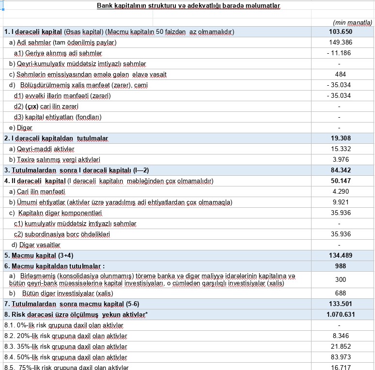 2023-cü ilin ilk rübündə bankın dinamik inkişafı əsas maliyyə göstəricilərinin artımında da özünü göstərib. Hesabat dövründə Bankın məcmu kapitalı ötən ilin 1-ci rübü ilə müqayisədə 30 % artaraq, 134 milyon manat olub. Rüb ərzində bankın aktivləri bir qədər də artaraq, 1 milyard 446 milyon manatı ötüb.