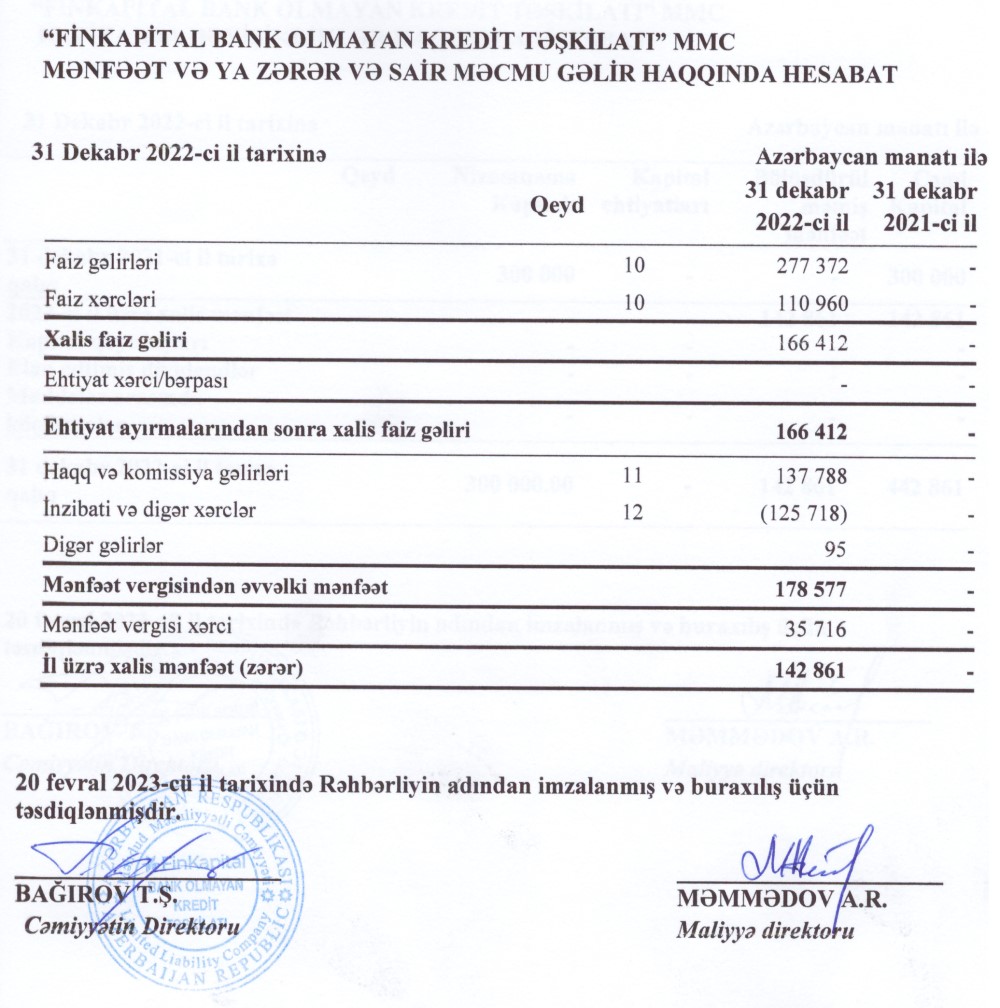 "FinKapital Bank Olmayan Kredit Təşkilatı" MMC-nin 31 dekabr 2022-ci il tarixində bitən il üzrə maliyyə hesabatları.2022-ci ilin yanvar ayında faktiki fəaliyyətə başlamış "FinKapital Bank Olmayan Kredit Təşkilatı" ilk ilini 142 min 861 manat xalis mənfəət ilə başa vurub.