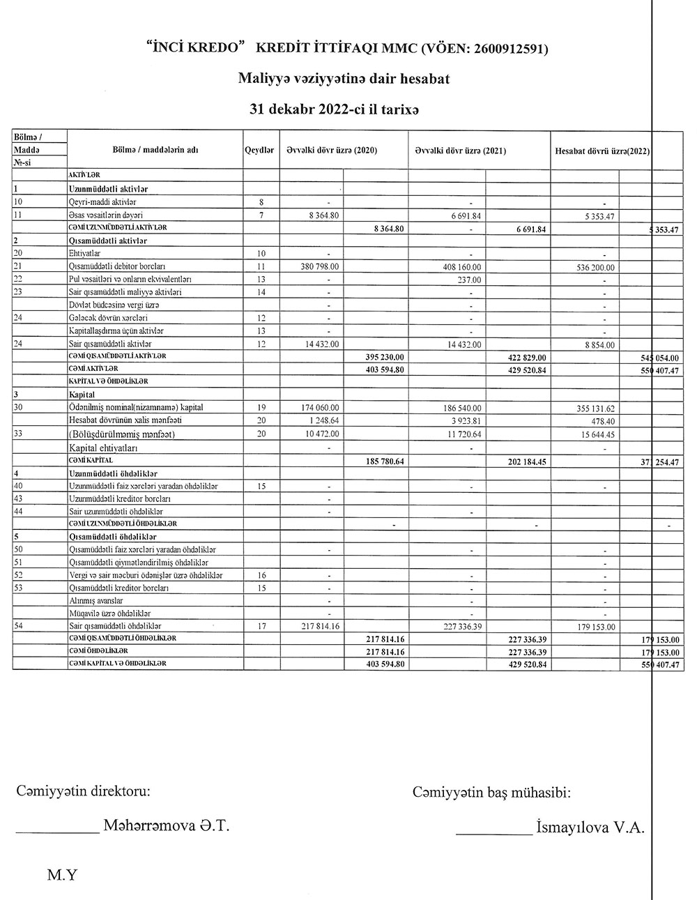 "İnci Kredo" Kredit İttifaqı MMC-nin 2022-ci il üzrə maliyyə göstəriciləri