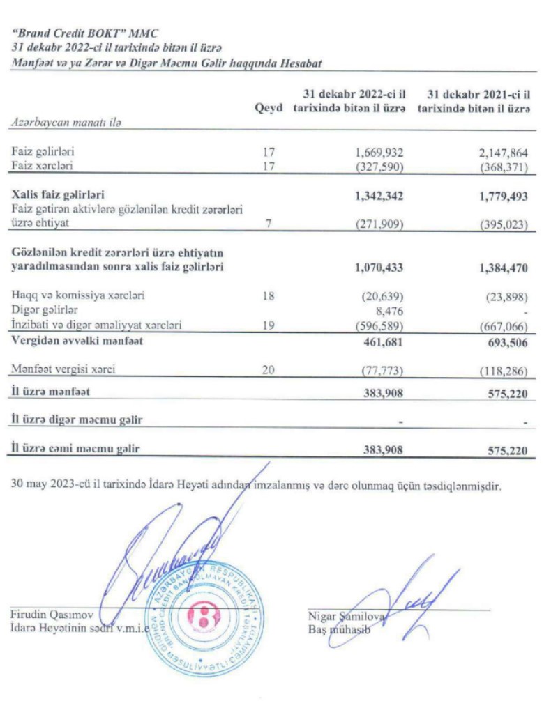 "Brand Credit BOKT" kiçilib, gəlirləri və mənfəəti azalıb
