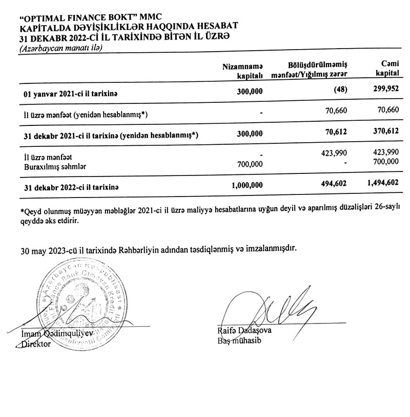“Optimal Finance BOKT” MMC 2022-ci il üzrə maliyyə hesabatını açıqladı