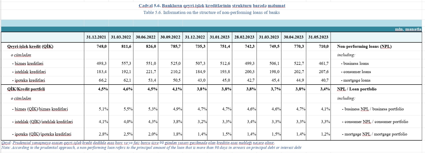 30 May 2023-ü il tarixində Azərbaycan banklarının cəmi kredit portfelində qeyri-işlək kreditlərinin məbləği 710 milyon manat təşkil edib.