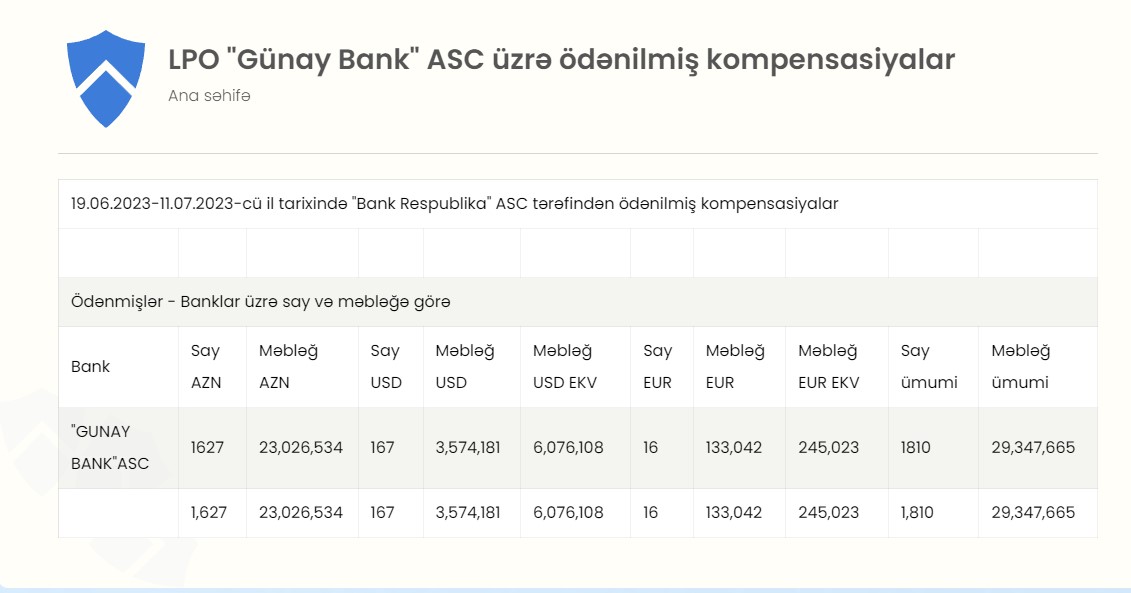 Artıq ümumi kompensasiya məbləğinin 83,5%-i əmanətçilərə ödənilib.19.06.2023-11.07.2023-cü il tarixində "Bank Respublika" ASC tərəfindən ləğv edilən "Günay Bank" ASC-nin qorunan əmanətçilərinə ödənilmiş kompensasiyaların məbləği açıqlanıb.