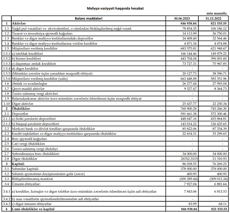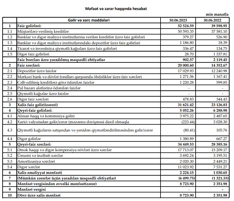 Müqayisə üçün qeyd edək ki, 2022-ci ilin ilk 6 ayında "Yelo Bank"ın cəmi əməliyyat gəlirləri 45 milyon 886 min manat, cəmi əməliyyat xərcləri 44 milyon 856 min manat, əməliyyat mənfəəti 1 milyon 31 min manat təşkil etmişdi. Ehtiyatdan azad olan 1 milyon 321 min manatın hesabına mənfəət 2 milyon 352 min manata yüksəlmişdi.