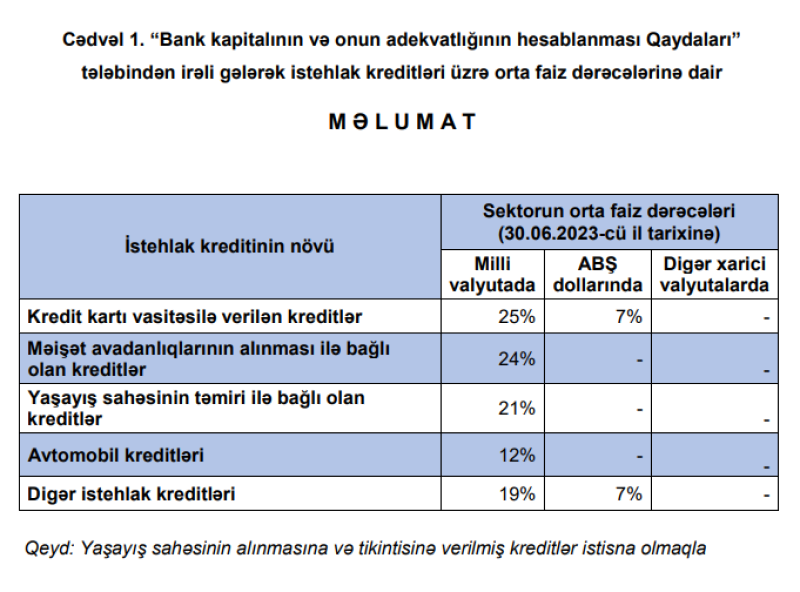 Azərbaycan Mərkəzi Bankı istehlak kreditləri üzrə orta faiz dərəcələrini açıqlayıb.