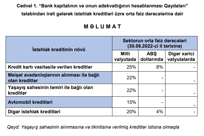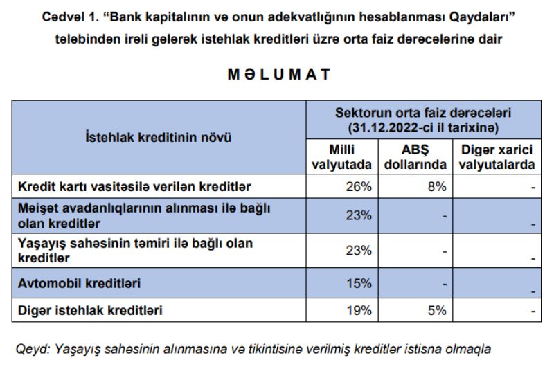 Ötən ilin sonunda, milli valyutada, orta faiz dərəcəsi - kredit kartı vasitəsilə verilən kreditlər üzrə 26%, məişət avadanlıqlarının alınması ilə bağlı olan kreditlər üzrə 23%, yaşayış sahəsinin təmiri ilə bağlı olan kreditlər üzrə 23%, avtomobil kreditləri üzrə 15% və digər istehlak kreditləri üzrə 19% təşkil etmişdi.