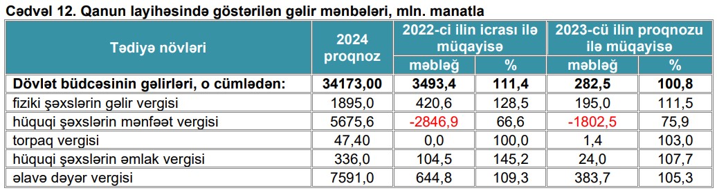Qeyd edilib ki, 2024-cü ilin dövlət büdcəsinin gəlirləri, 2023-cü ilin proqnozundan 282,5 milyon manat çox, cari ilin gözlənilən göstəricisi ilə müqayisədə isə 734,5 milyon manat az olmaqla 34 milyard 173 milyon manat proqnozlaşdırılmışdır.