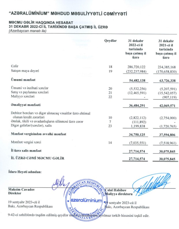 Marja.az-ın şirkətin maliyyə hesabatına istinadən məlumatına görə, "Azəralüminium" MMC-nin satışdan gəlirləri 2021-ci ildə 234 milyon 385 min manat ikən, 2022-ci ildə 286 milyon 720 min manata yükəlib.