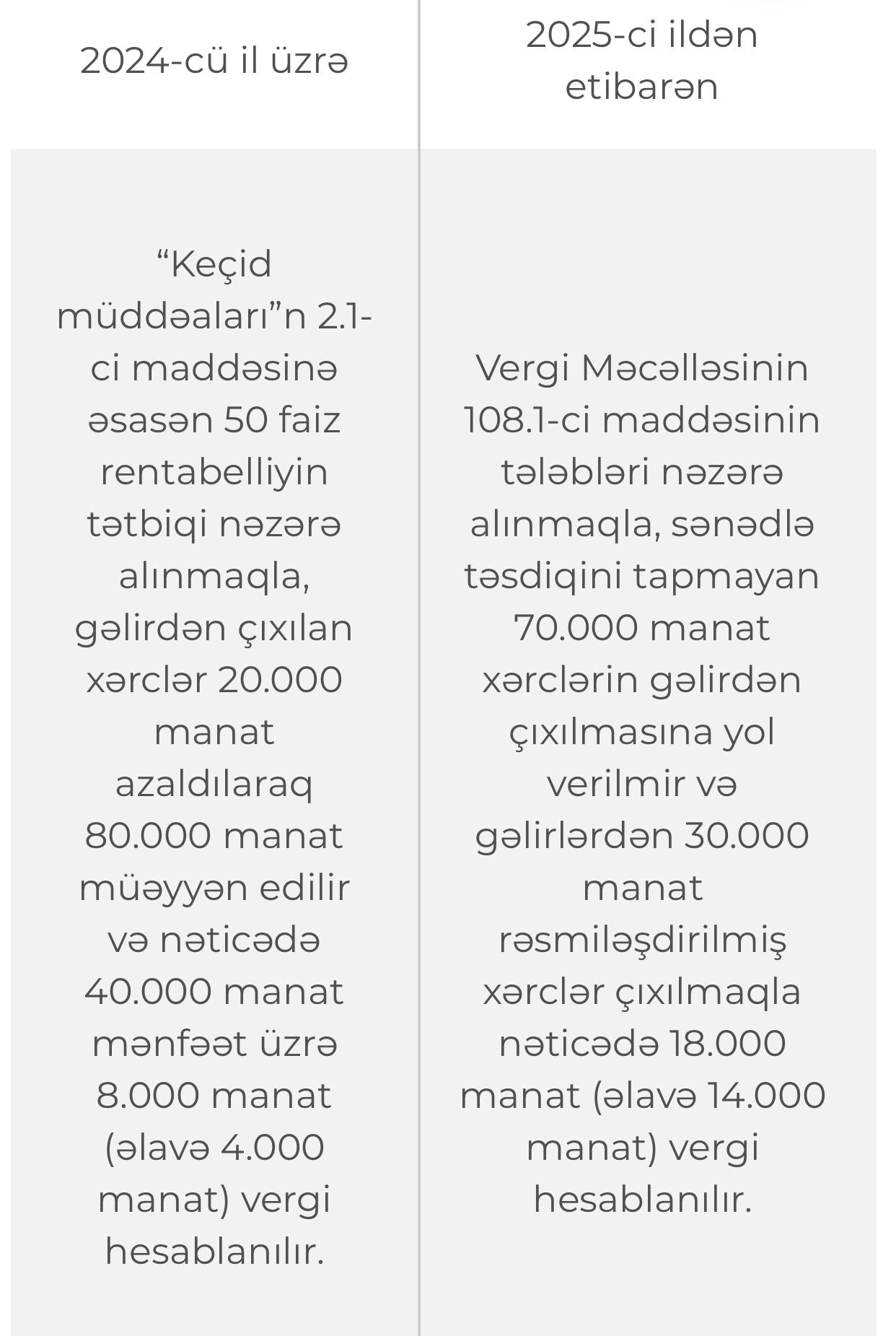 Bununla belə, bəzi sahələrdə faktiki xərclərin çəkilməsinə baxmayaraq, həmin xərclərin sənədlərlə rəsmiləşdirilməsində çətinliklərin mövcudluğunu nəzərə alaraq, “Azərbaycan Respublikasının Vergi Məcəlləsində dəyişiklik edilməsi haqqında” 5 dekabr 2023-cü il tarixli Qanunun “Keçid müddəaları”nın 2.1-ci maddəsinin müddəalarına görə, sənədlərlə rəsmiləşdirilməyən xərclərin gəlirdən çıxılmasının məhdudlaşdırılması 2025-ci il yanvarın 1-dək 50 faiz rentabellik nəzərə alınmaqla tətbiq olunacaq. 2025-ci ilin yanvarın 1-dən etibarən qanunla müəyyən edilmiş qaydada rəsmiləşdirilməyən xərclərin gəlirdən çıxılmasına yol verilməyəcək.