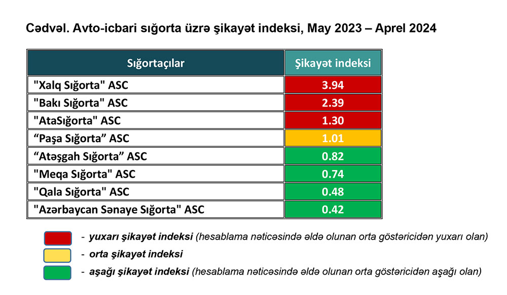 Qeyd edilib ki, avto-icbari sığorta üzrə şikayət indeksi vətəndaşların bu növ üzrə sığorta xidmətlərini əldə edərkən seçim etmələrinə dəstək göstərilməsi məqsədilə hesablanılır və yayımlanır. Şikayət indeksinin hesablanmasında beynəlxalq səviyyədə istifadə olunan metodologiyaya əsaslanaraq avto-icbari sığorta növü üzrə lisenziyası aktiv olan sığorta şirkətləri ilə bağlı daxil olan şikayətlər nəzərə alınmışdır. Eyni zamanda avto-icbari sığorta növünün aparılması üzrə verilən icazənin ləğv edilməsi yolu ilə lisenziyasının qüvvəsi məhdudlaşdırılmış və lisenziyası ləğv olunmuş sığorta şirkətləri ilə bağlı şikayətlərin tənzimlənməsi Mərkəzi Bank tərəfindən əvvəlki qaydada davam etdirilir.