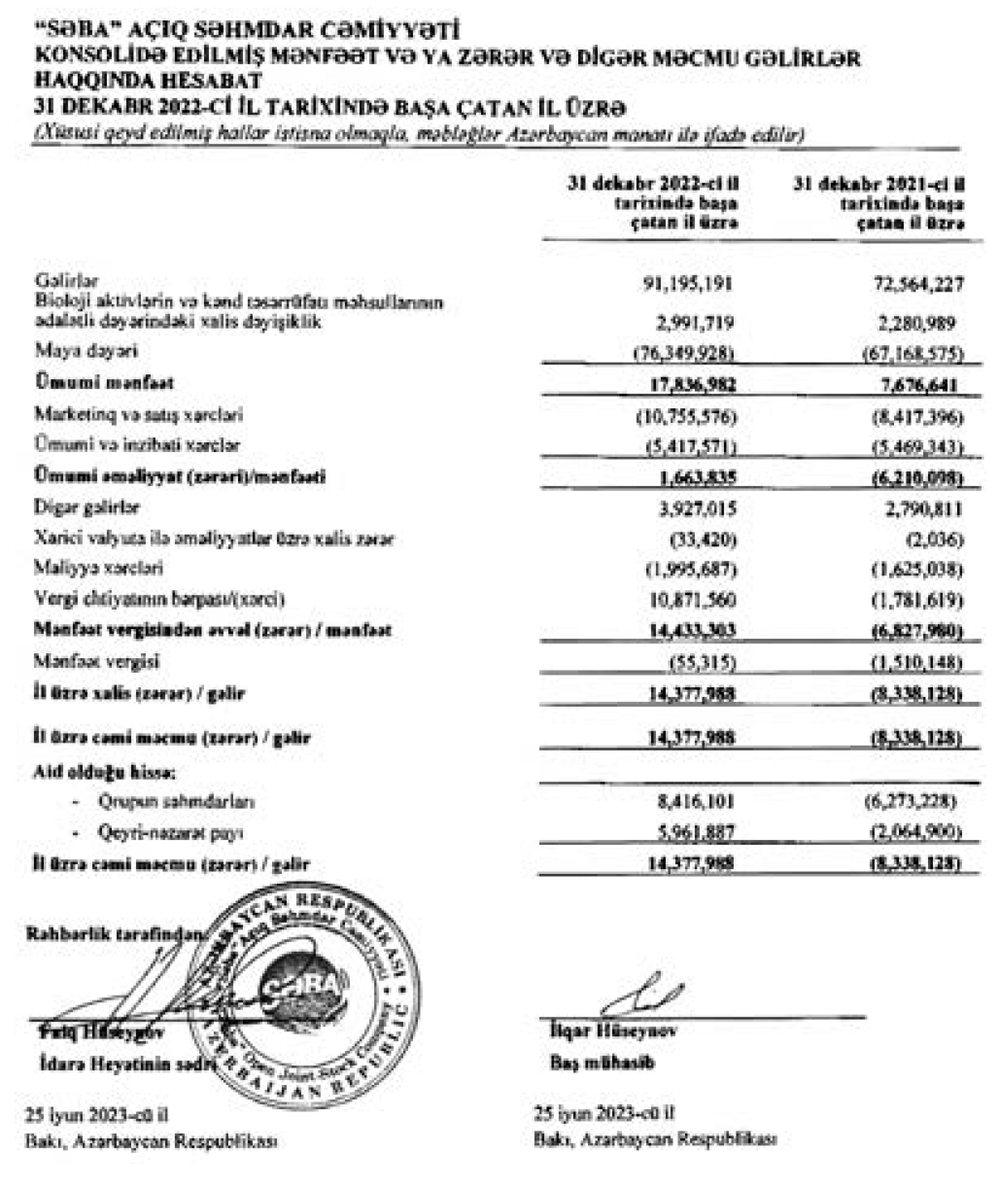 2022-ci ildə "SƏBA" ASC-nin satışdan gələri 91 milyon 195 min manat, xalis mənfəəti 14 milyon 378 min manat təşkil edib."SƏBA" ASC və onun törəmə müəssisələri ("SƏBA Group") 2022-ci ili 14 milyon 378 min manat xalis mənfəət ilə başa vurub. Halbuki, Şirkət 2021-ci ili 8 milyon 338 min manat xalis zərər ilə bağlamışdı. Şirkətin 2022-ci ildə zərərdən mənfəətə keçməsi gəlirlərinin artması ilə əlaqədardır.