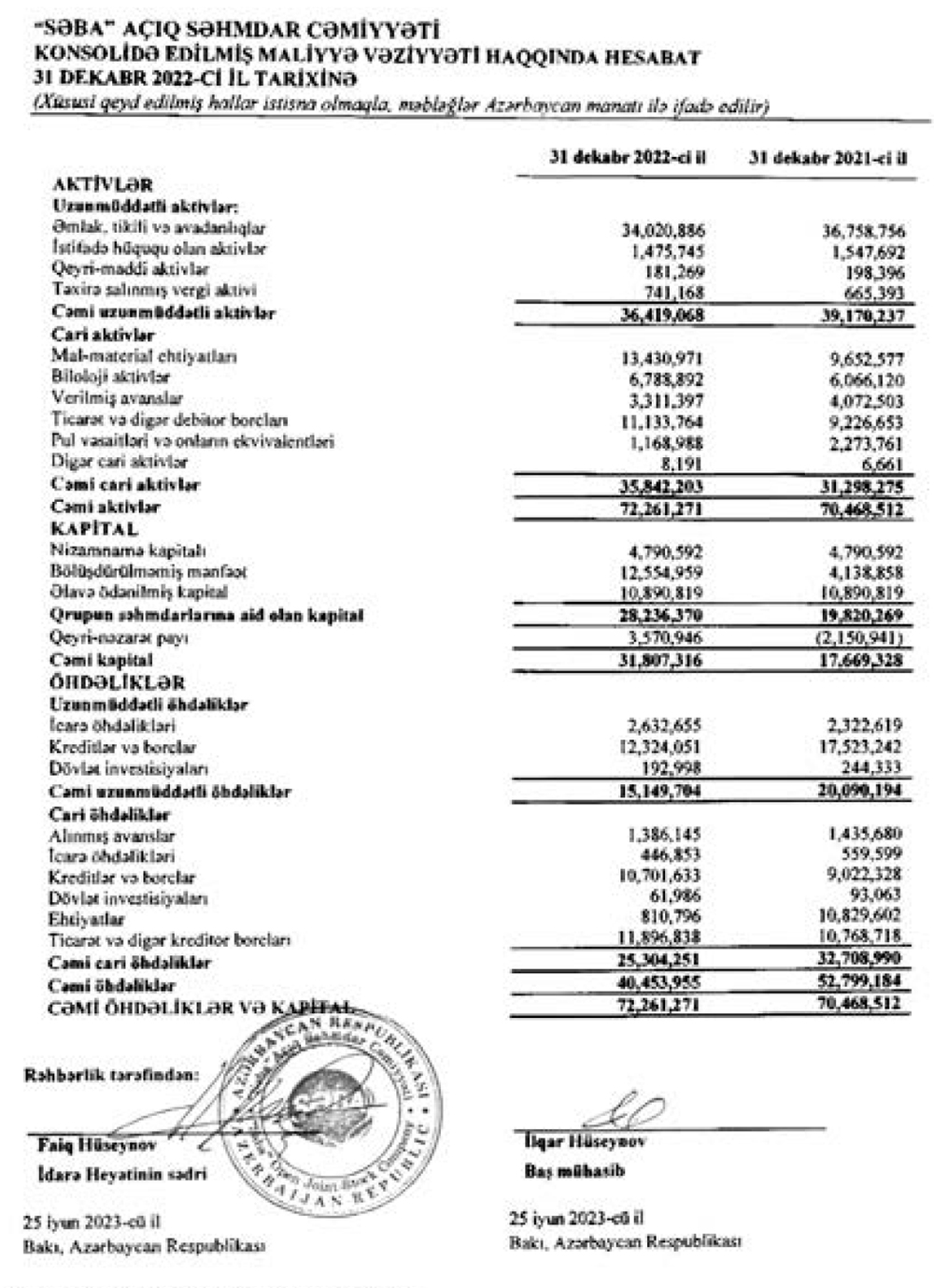 31 dekabr 2022-ci il tarixində "SƏBA" ASC 72 milyon 261 min manat cəmi aktivlərə malik olub. Şirkət 2021-ci ilin sonunda 70 milyon 469 min manat vəmi aktivlər əmalik idi.