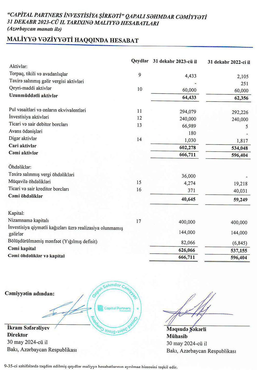 "Capital Partners İnvestisiya Şirkəti" QSC 2023-cü ili 94 min 533 manat xalis mənfəət ilə başa vurub. Şirkət 2022-ci ili 6 min 688 manat xalis zərər ilə bağlamışdı.