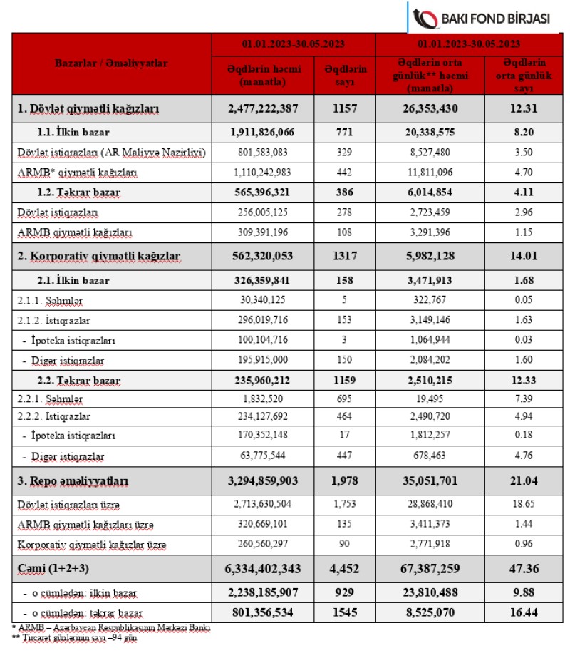 Birjanın yaydığı məlumatda bildirilir ki, ötən ilin müvafiq dövrü ilə müqayisədə korporativ qiymətli kağızaların ticarət həcmində 42%, dövlət qiymətli kağızların ticarət həcmində isə 31%, repo əməliyyatları üzrə 221% artım olmuşdur. O cümlədən, ötən il ilə müqayisədə korporativ qiymətli kağızların repo əməliyyatların bazarı üzrə 123% artım qeydə alınmışdır.