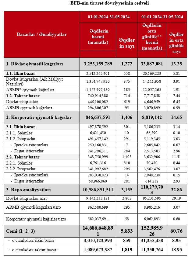 Bakı Fond Birjasında 2024-cü ilin yanvar-may ayları ərzində qiymətli kağızlar üzrə keçirilən əməliyyatların ümumi həcmi 14 milyard 686 milyon 648 min 891 manat təşkil etmişdir. Birjasda 2023-cü ilin yanvar-may ayları ərzində qiymətli kağızlar üzrə keçirilən əməliyyatların ümumi həcmi 6 milyard 334 milyon 402 min 343 manat təşkil etmişdi.