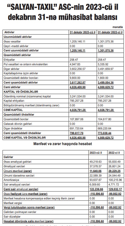 "Salyan Taxıl" ASC 2023-cü ili 111 min manat xalis zərər ilə başa vurub. Şirkət 2022-ci ili 100 min manat xalis zərər ilə bağlamışdı.