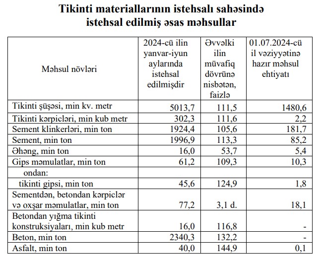 Qeyd edilib ki, dövr ərzində sementdən, betondan kərpiclər və oxşar məmulatların istehsalı 3,1 dəfə, asfalt istehsalı 44,9 faiz, beton istehsalı 32,2 faiz, tikinti gipsinin istehsalı 24,9 faiz, betondan yığma tikinti konstruksiyalarının istehsalı 16,8 faiz, sement istehsalı isə 13,3 faiz artmışdır.