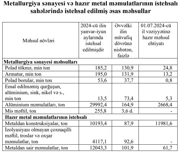 2024-сü ilin yanvar-iyun aylarında metallurgiya sənayesi üzrə mis məftilin istehsalı 3,6 dəfə, alüminium məmulatlarının istehsalı 64,9 faiz, armatur istehsalı 31,9 faiz, hazır metal məmulatlarının istehsalı sahəsi üzrə metaldan sair məmulatların istehsalı isə 1,9 faiz artmışdır.