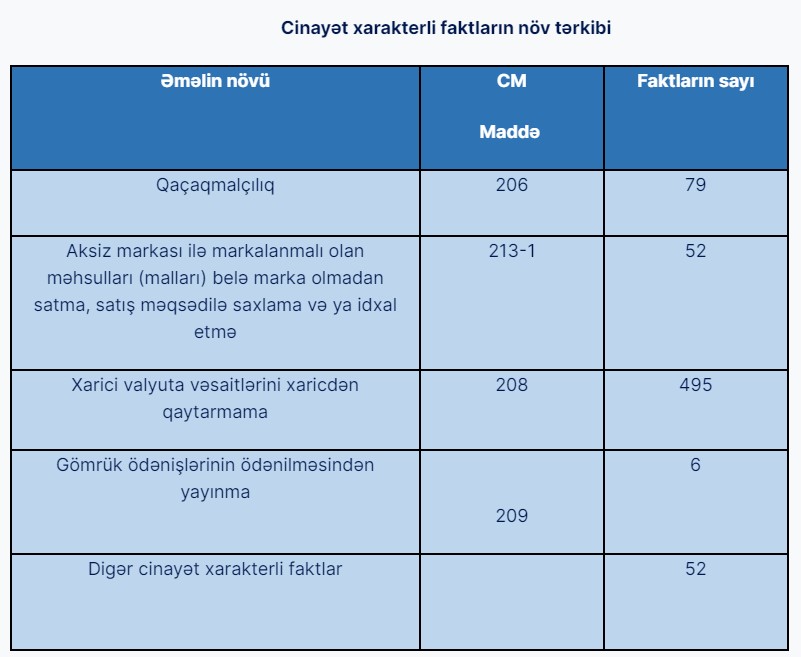 Qeyd olunan dövr ərzində qabaqcadan əlbir olan bir qrup şəxs və ya mütəşəkkil dəstə tərəfindən qızıl məmulatlarının, iri vergi tutumlu aksizli və digər bu qəbildən olan malların qanunsuz gətirilməsi üzrə törədilmiş bir sıra cinayətlərin qarşısı alınmış, onların istifadə etdiyi qaçaqmalçılıq kanalları aşkar olunaraq zərərsizləşdirilmişdir.