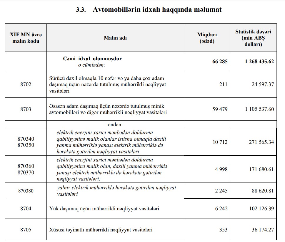Azərbaycana hibrid, elektrik, yük avtomobillərinin və xüsusi texnikaların idxalı isə artıb.