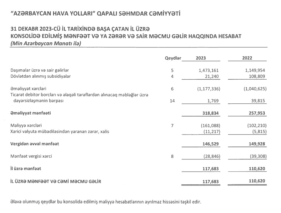 Quru sərhədlər bağlı ikən, "Azərbaycan Hava Yolları" QSC (AZAL) 2023-cü ili 117 milyon 683 min manat xalis mənfəət ilə başa vurub. Şirkət 2022-ci ili 110 milyon 620 min manat xalis mənfəət ilə bağlamışdı. Beləliklə, AZAL-ın xalis mənfəəti 2022-ci illə müqayisədə 2023-cü ildə 7 milyon 63 min manat və ya 6,4% artıb.
