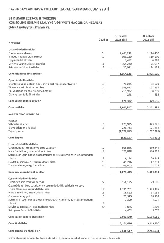 31 dekabr 2023-cü il tarixində AZAL-ın cəmi aktivləri 2 milyard 640 milyon 517 min manat olub ki, bu da illik müqayisədə 17,8 % çoxdur. Hesabat dövründə aviaşirkətin öhdəlikləri 5,2 % artaraq 3 milyard 169 milyon 624 min manata çatıb, balans kapitalının çatışmazlığı isə 31,5% azalaraq 529 milyon 107 min manata düşüb.