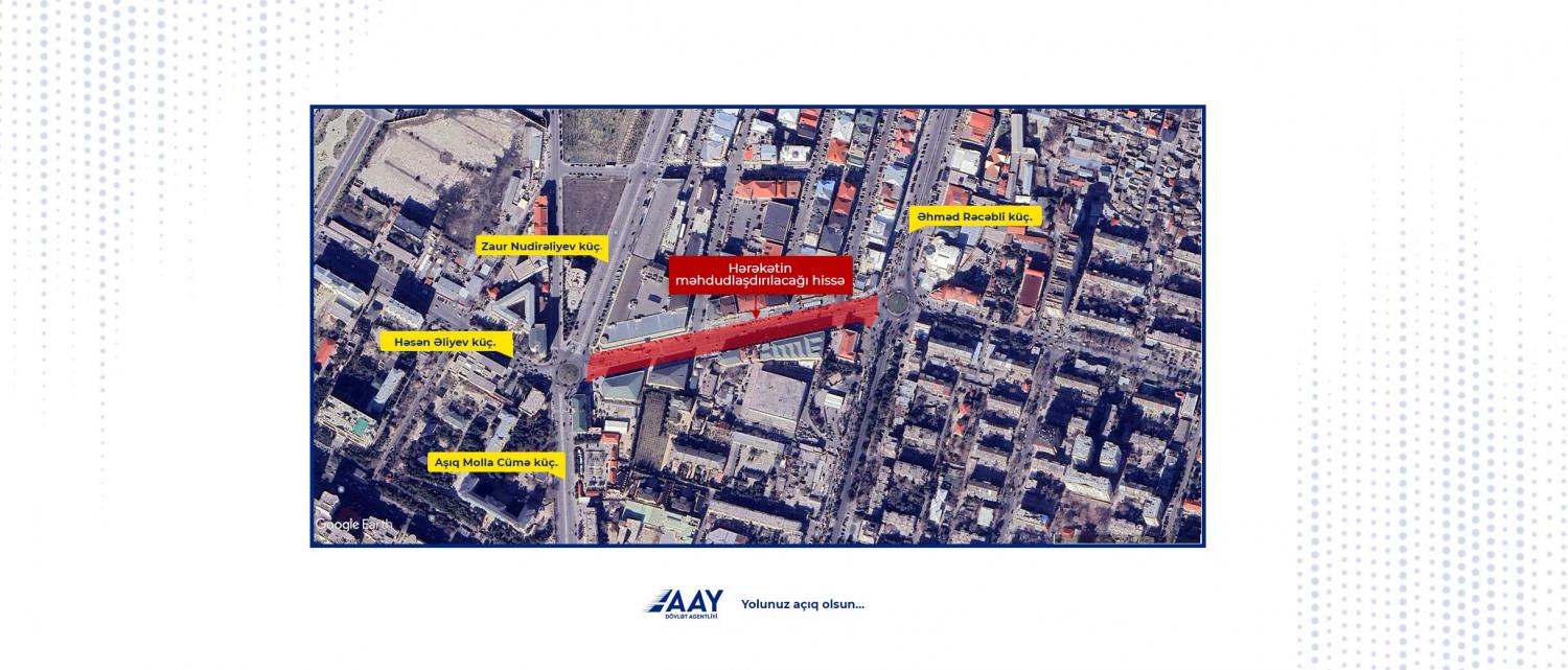 Fevralın 1-də saat 06:00-dan etibarən Bakının Nərimanov rayonunun Aşıq Molla Cümə və Zaur Nudirəliyev küçələrinin kəsişməsindəki dairə ilə Əhməd Rəcəbli dairəsi arasında aparılacaq təmir-tikinti işləri ilə əlaqədar sözügedən ərazidə avtonəqliyyat vasitələrinin hərəkəti tam məhdudlaşdırılacaq.