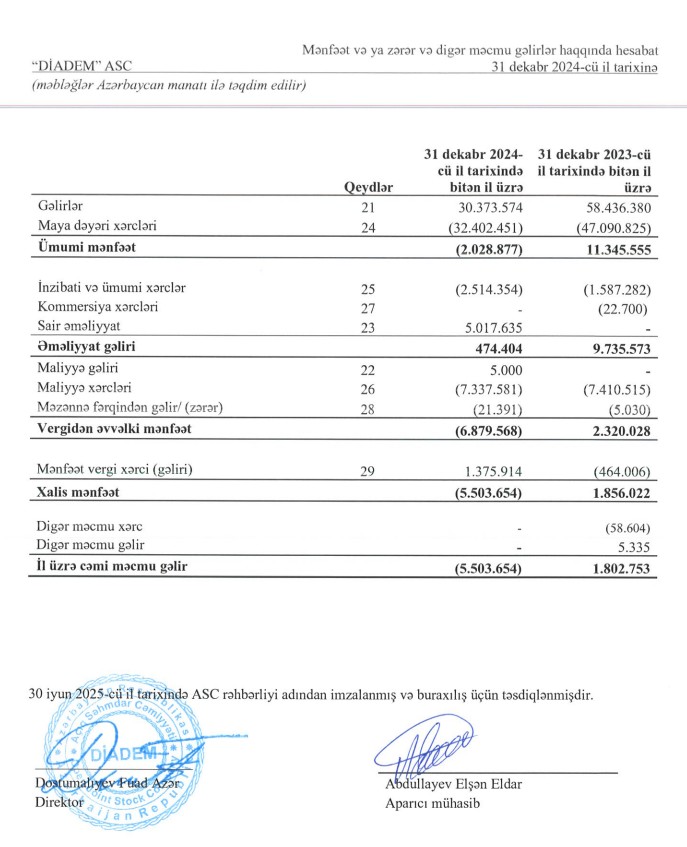 Tikinti obyektlərinin, bina və qurğuların, inşaat konstruksiyalarının memarlıq layihələndirilməsi, qeyri-yaşayış binalarının tikintisi xidmətlərini göstərən "Diadem" ASC 2024-cü ili 5 milyon 504 min manat xalis zərər ilə başa vururb. Halbuki, şirkət 2023-cü ili 1 milyon 803 min manat xalis mənfəət ilə bağlamışdı. "Diadem" ASC-nin gəlirlərinin kəskin azalması xalis zərərin hesabatlarında görünən səbəbidir.