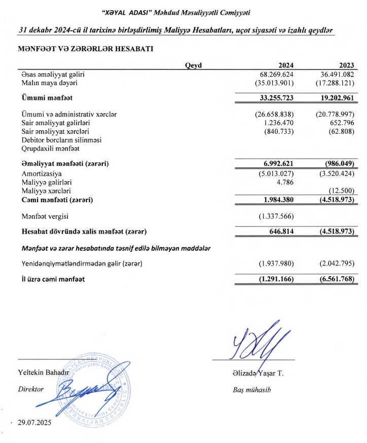 “Xəyal Adası” şirkətinin əsas əməliyyat gəliri 2023-cü ildə 36 milyon 491 min manat ikən, 2024-cü ildə 68 milyon 270 min manata yüksəlib (31 milyon 779 min manat və ya 87% artıb).