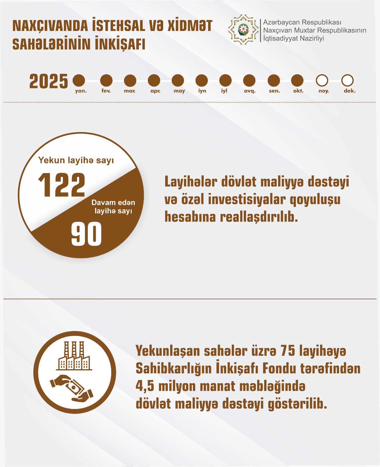 2025-ci ilin 10 ayı ərzində dövlət maliyyə dəstəyi və özəl investisiya qoyuluşu hesabına iqtisadi fəaliyyətin müxtəlif sahələri üzrə 122 istehsal və xidmət sahəsi istifadəyə verilib. Yekunlaşan sahələr üzrə 75 layihəyə Sahibkarlığın İnkişafı Fondu tərəfindən 4,5 milyon manat məbləğində dövlət maliyyə dəstəyi göstərilib.