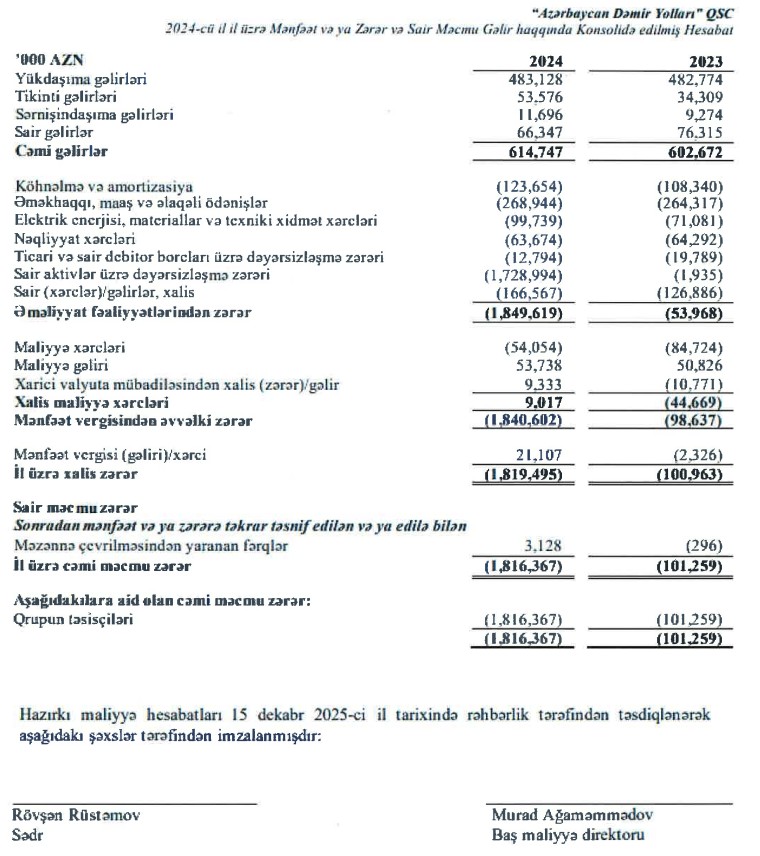 "Azərbaycan Dəmir Yolları"nın özündən böyük defisiti var"Azərbaycan Dəmir Yolları" QSC (ADY) 2024-cü ili 1 milyard 819 milyon 495 min manat xalis zərər ilə başa vurub. QSC 2023-cü ili 100 milyon 963 min manat xalis zərər ilə bağlamışdı. Beləliklə, ötən il 2023-cü illə müqayisədə "Azərbaycan Dəmir Yolları"nın xalis zərəri 18 dəfə və ya 1 milyard 718 milyon 532 min manat artıb.