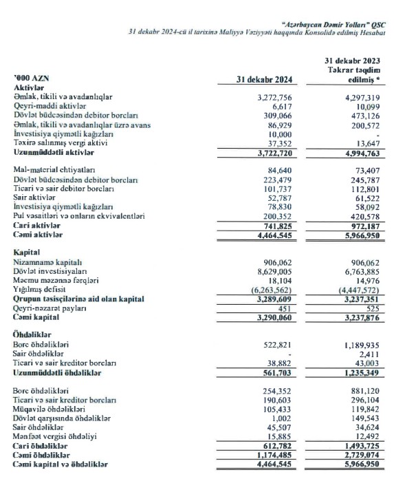 "Azərbaycan Dəmir Yolları" QSC 31 dekabr 2024-cü il tarixində 4 milyard 464 milyon 545 min manat cəmi aktivlərə malik olub. Şirkət 2023-cü ilin sonunda 5 milyard 966 milyon 950 min manat cəmi aktivlərə malik idi. Əsas vəsaitlərin əmlak, tikili və avadanlıqlar bəndi üzrə azalma cəmi aktivlərin düşməsinə səbəb olub.