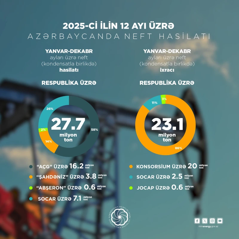 Marja.az xəbər verir ki, 2025-ci il üzrə operativ məlumatlara əsasən, respublikada 27,7 milyon ton neft (qaz kondensatı ilə birlikdə) hasil edilib. Hasilatın 16,2 milyon tonu “Azəri-Çıraq-Günəşli”nin, 3,8 milyon tonu “Şahdəniz”in, 0,6 milyon tonu “Abşeron” yatağının, 7,1 milyon tonu isə SOCAR-ın payına düşüb.