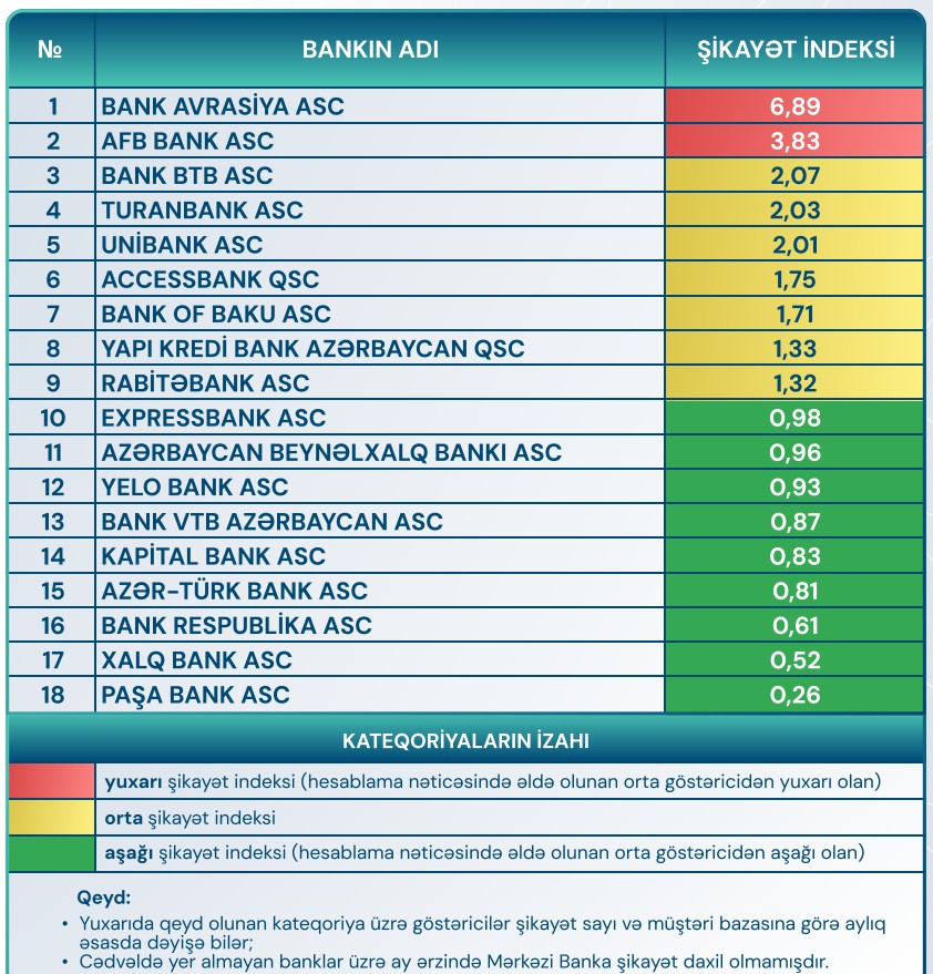 "Bank BTB", "Turanbank", "Unibank", "AccessBAnk", "Bank of Baku", "Yapı Kredi Bank Azərbaycan" və "Rabitəbank" orta şikayət indeksində (sarı zonada) qərarlaşıblar.
