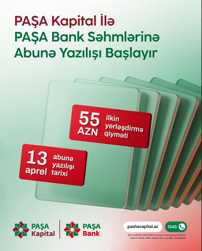 (®) 13 aprel 2026-cı il tarixində PAŞA Kapital-ın əsas anderrayteri olduğu ölkənin ilk korporativ İlkin Kütləvi Təklifi (IPO) - PAŞA Bank səhmlərinə abunə yazılışı başlayır.