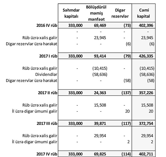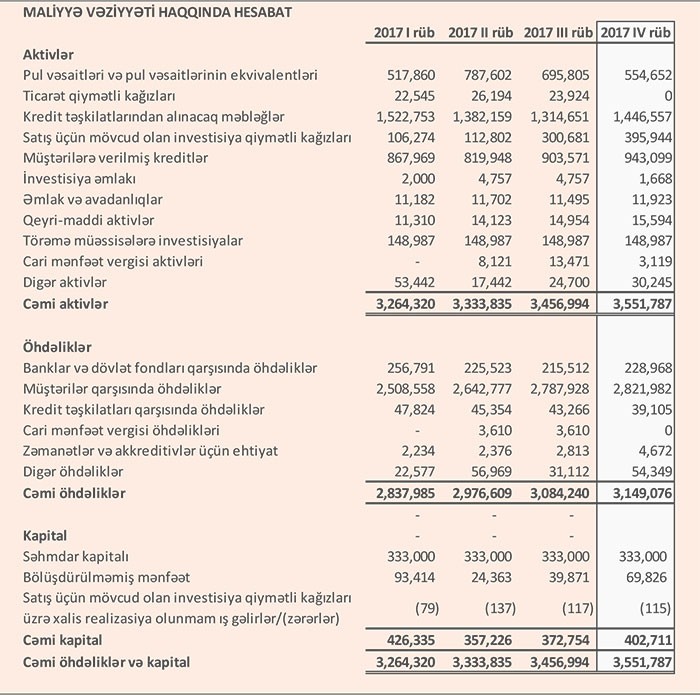 Rüblük hesabata görə, 31 Dekabr 2017-ci il tarixində PAŞA Bank 3 milyard 551 milyon 787 min manat cəmi aktivlərə, 3 milyard 149 milyon 76 min manat cəmi öhdəliklərə və 402 milyon 711 min manat cəmi balans kapitalına malik olub.