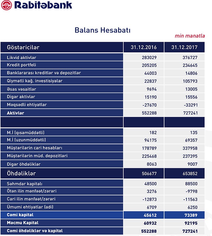 31 Dekabr 2017-ci il tarixində "RabitəBank" 727 milyon 241 min manat cəmi aktivlərə, 653 milyon 852 min manat cəmi öhdəliklərə və 73 milyon 389 min manat cəmi balans kapitalına malik olub.