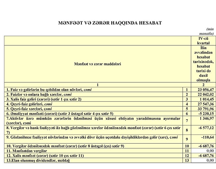 Ötən il Bankın cəmi gəlirləri 50 milyon 603 min manat, o cümlədən faiz gəlirləri 23 milyon 56 min manat, qeyri-faiz gəlirləri 27 milyon 547 min manat təşkil edib. Bankın faiz və qeyri-faiz xərcləri cəmi gəlirlərindən çox (55 milyon 833 min manat) olduğundan 5 milyon 230 min manat əməliyyat zərəri yaranıb. Bundan başqa, aktivlər üzrə mümkün zərərlərin ödənilməsi üçün xüsusi ehtiyatın yaradılmasına 1 milyon 347 min manatlıq ayırma zərəri daha da artırb və 6 milyon 688 min manata çatıb.