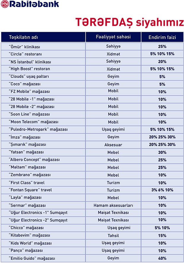Rabitəbankın hər növ kartının xüsusi endirimləri ilə hər bir müştəri hətta adi günlərdə özünü özəl hiss edərək eksklüziv təkliflərdən, endirimlərdən və aksiyalardan zövq alacaqlar.