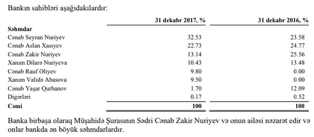 Bankın audit olunan maliyyə hesabatına əsasən, 2017-ci ilin sonuna Z.Nuriyev bankın ən iri səhmdarı deyil. Eyni zamanda, Z.Nuriyev və onun ailə üzvləri bank üzərində nəzarəti saxlayırlar və əsas səhmdarlardır.