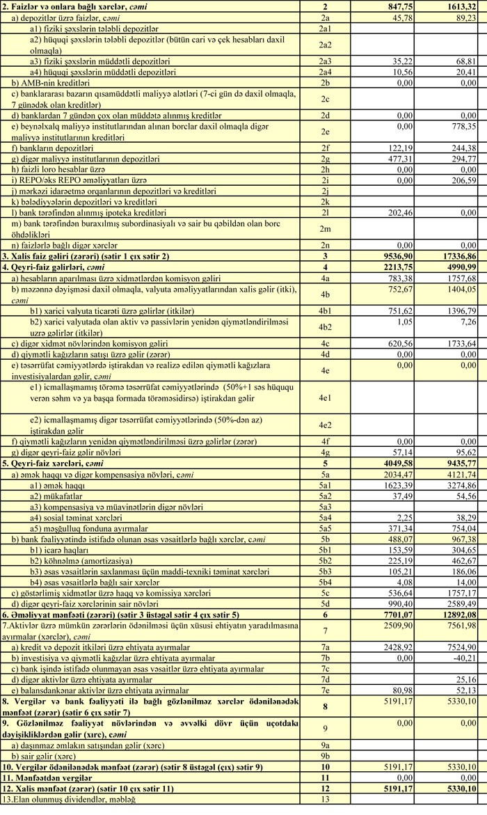 Müqayisə üçün qeyd edək ki, 2017-ci ilin birinci yarısında “AFB Bank”ın faiz gəlirləri 11 milyon 289 min manat, qeyri-faiz gəlirləri 5 milyon 607 min manat, əməliyyat mənfəəti 8 milyon 967 min manat təşkil etmişdi. Bank ehtiyatlara 8 milyon 793 min manat ayırdığından həmin dövrü 174 min manat xalis mənfəətlə başa vurmuşdu.