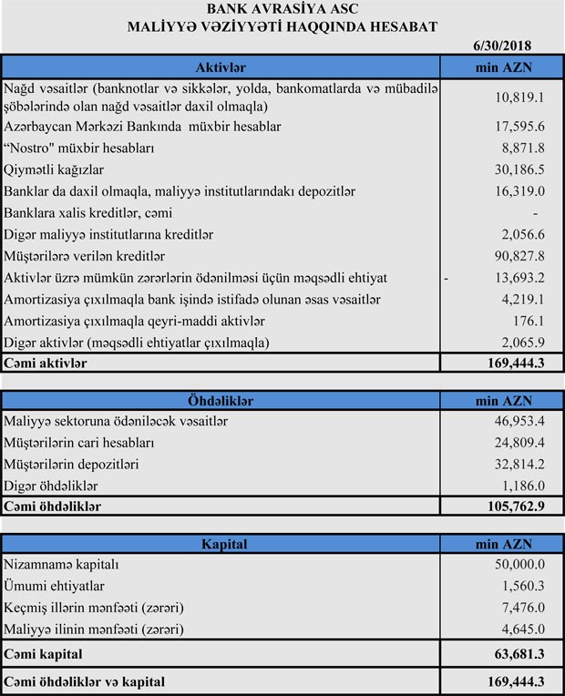 “Bank Avrasiya” ASC 30 İyun 2017-ci il tarixində 159,8 milyon manat cəmi aktivlərə, 97,8 milyon manat cəmi öhdəliklərə və 61,9 milyon manat cəmi balans kapitalına malik idi.