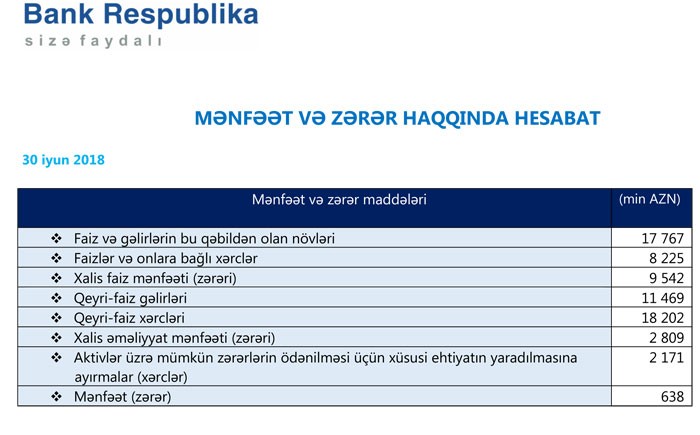 “Bank Respublika” ASC 2018-ci ilin birinci yarısını 638 min manat xalis mənfəətlə başa vurub. Halbuki Bank, 2017-ci ilin birinci yarısını 583 min manat zərər ilə bağlamışdı.