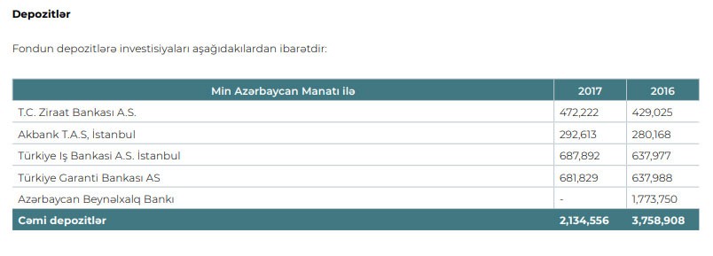 Neft Fondunun depozitləri "T.C. Ziraat Bankası A.S.", "Akbank T.A.S, İstanbul", "Türkiye Iş Bankasi A.S. İstanbul" və "Türkiye Garanti Bankası AS"dədir. Fond ötən il bu Türkiyə banklardında depozitlərini artırıb.